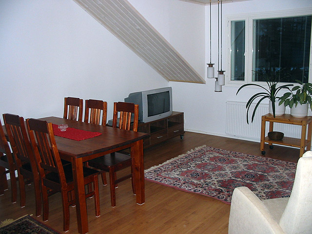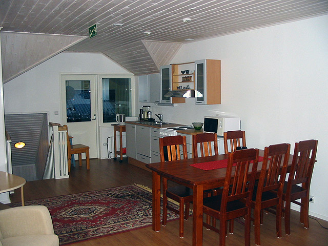 Tilan päärakennuksessa uusi huoneisto (v.2006), 2 huonetta 2 + 2 vuodetta kummassakin, mahdollisuus yhteen lisävuoteeseen/huone. Yhteinen tasokas keittiö ja oleskeluhuone sekä parveke. WC, suihkukaappi. Yhteissauna varattavissa erikseen. Hyvä keittiövarustus. TV, dvd ja cd-radio. Nopea nettiyhteys. Ei lemmikkejä huonetiloihin.